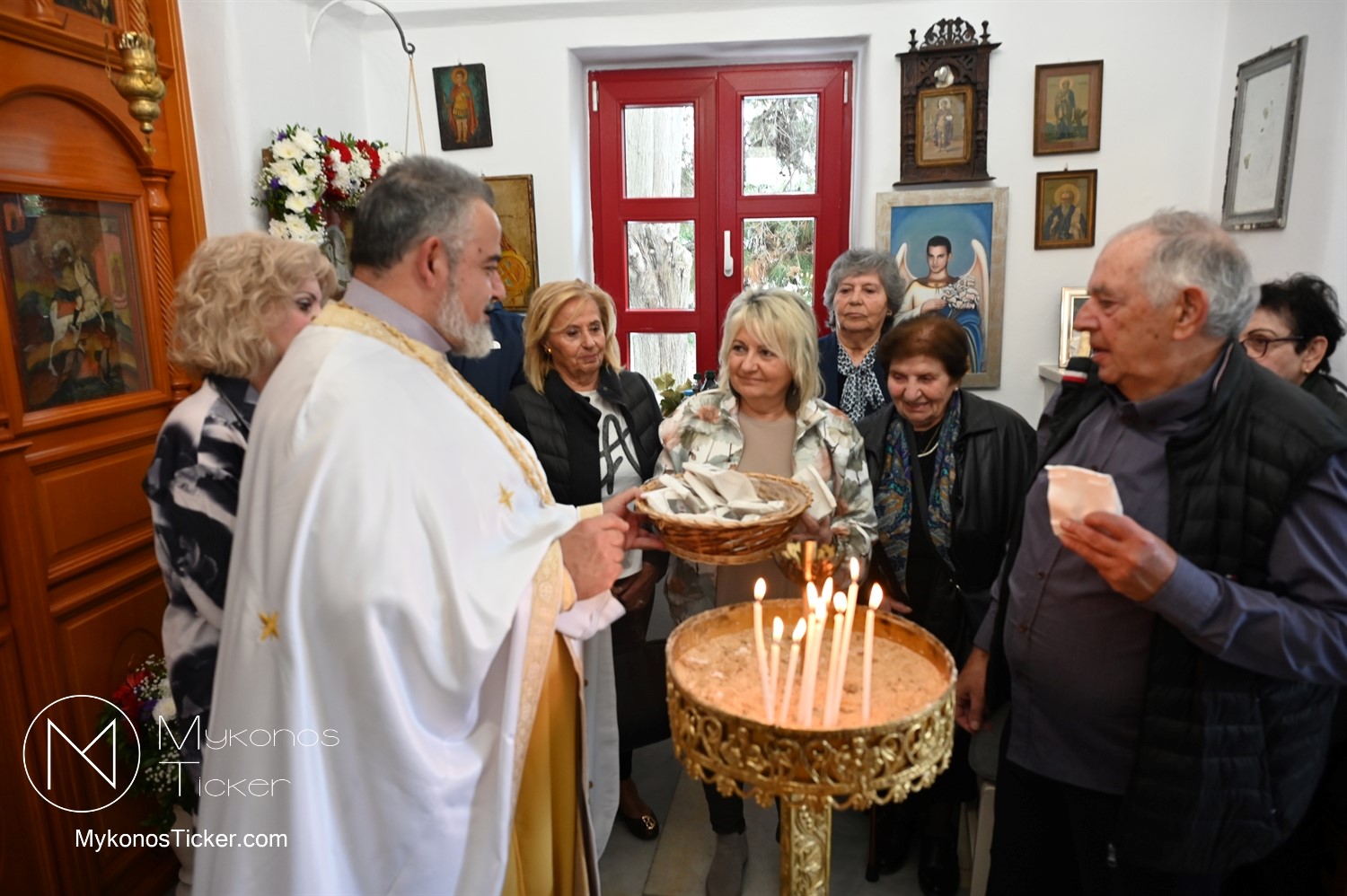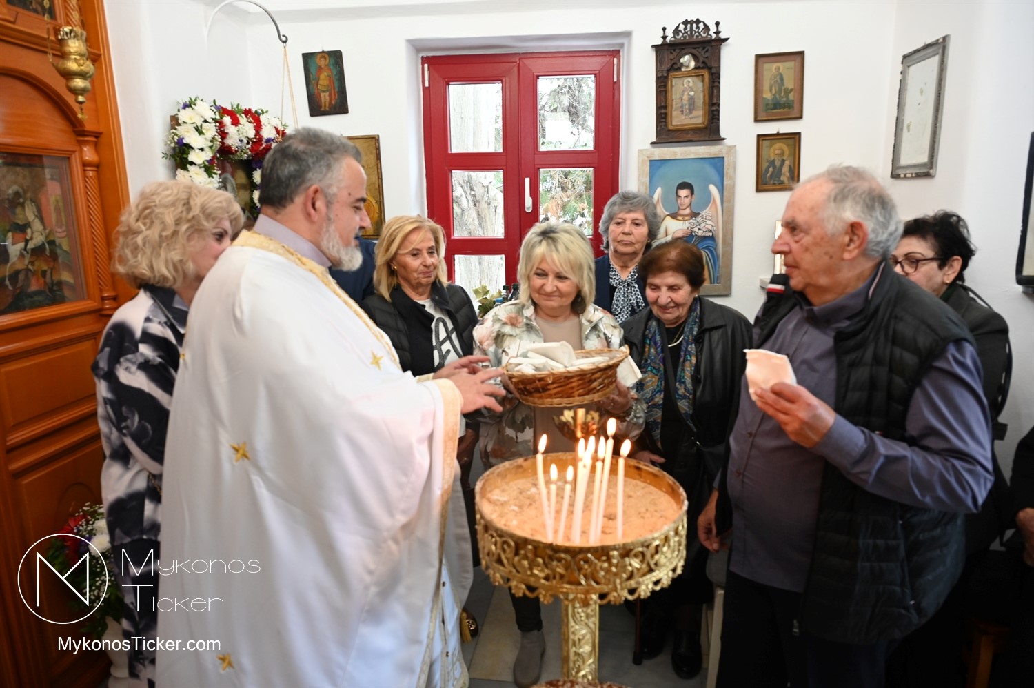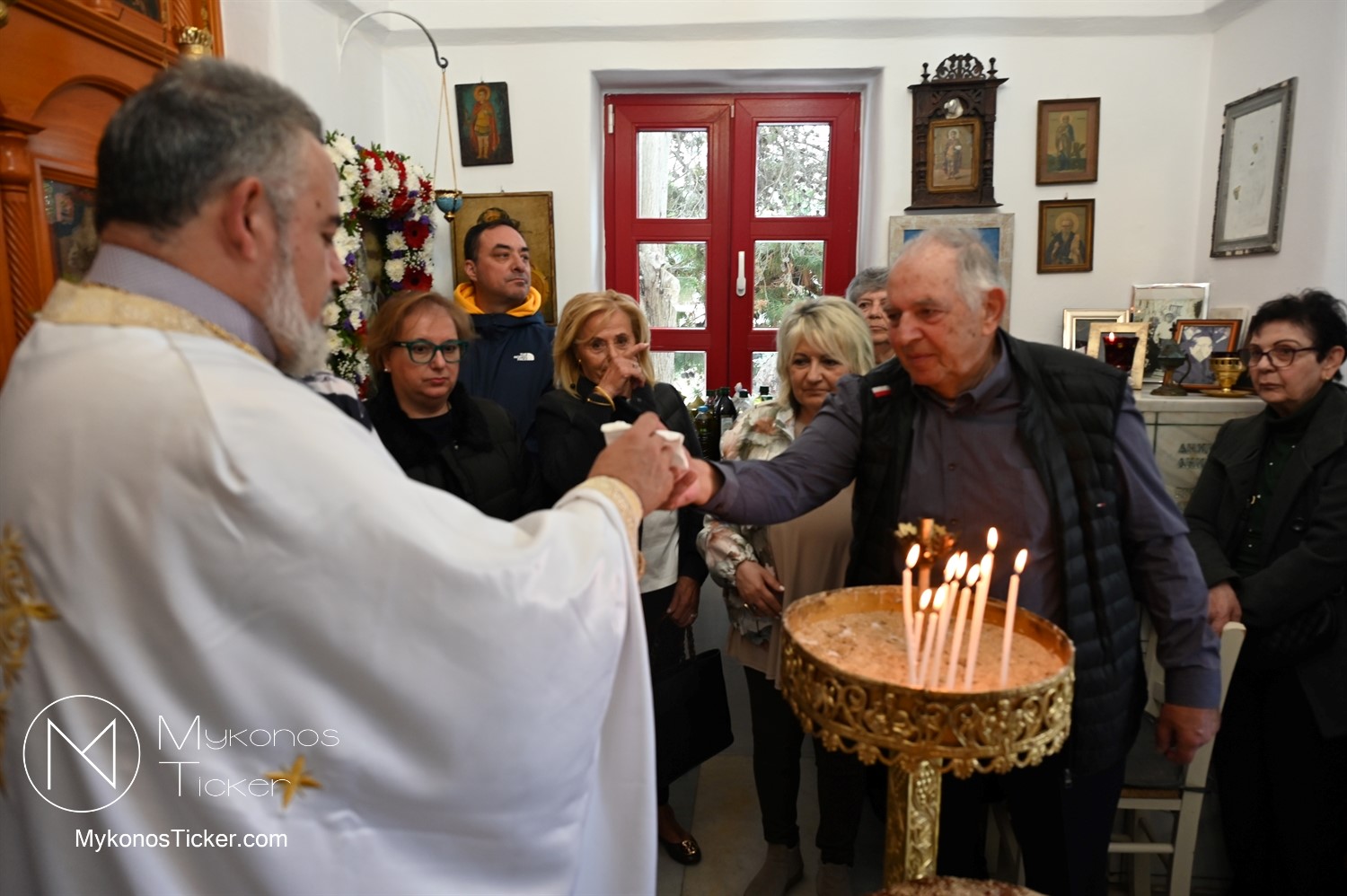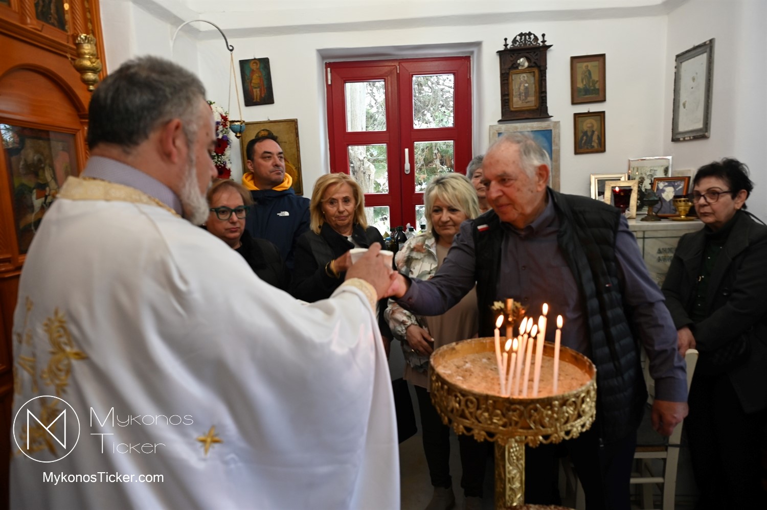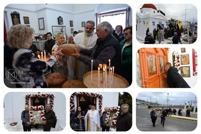 Ο μικρός μα πάνσεπτος ναός κατακλύστηκε από πλήθος Μυκονίων, οι οποίοι προσήλθαν με ευλάβεια για να αποθέσουν τον ασπασμό τους στον Άγιο των φτωχών, των κατατρεγμένων και των στρατιωτών. Ιδιαίτερη υπήρξε η συπροσευχητική παρουσία των αρχόντων του τόπου, οι οποίοι ενσωματώθηκαν ομοθυμαδόν στο Σώμα της Εκκλησίας. They attended Mykonos Mayor Christos Veronis, ο Αντιδήμαρχος Δημήτρης Κουτσούκος, καθώς και ο Δημοτικός Σύμβουλος και Πρόεδρος της ΔΕΥΑΜ Δημήτρης Λαζαρίδης, αποδεικνύοντας έμπρακτα τον άρρηκτο δεσμό των τοπικών θεσμών με την εκκλησιαστική ζωή του νησιού.