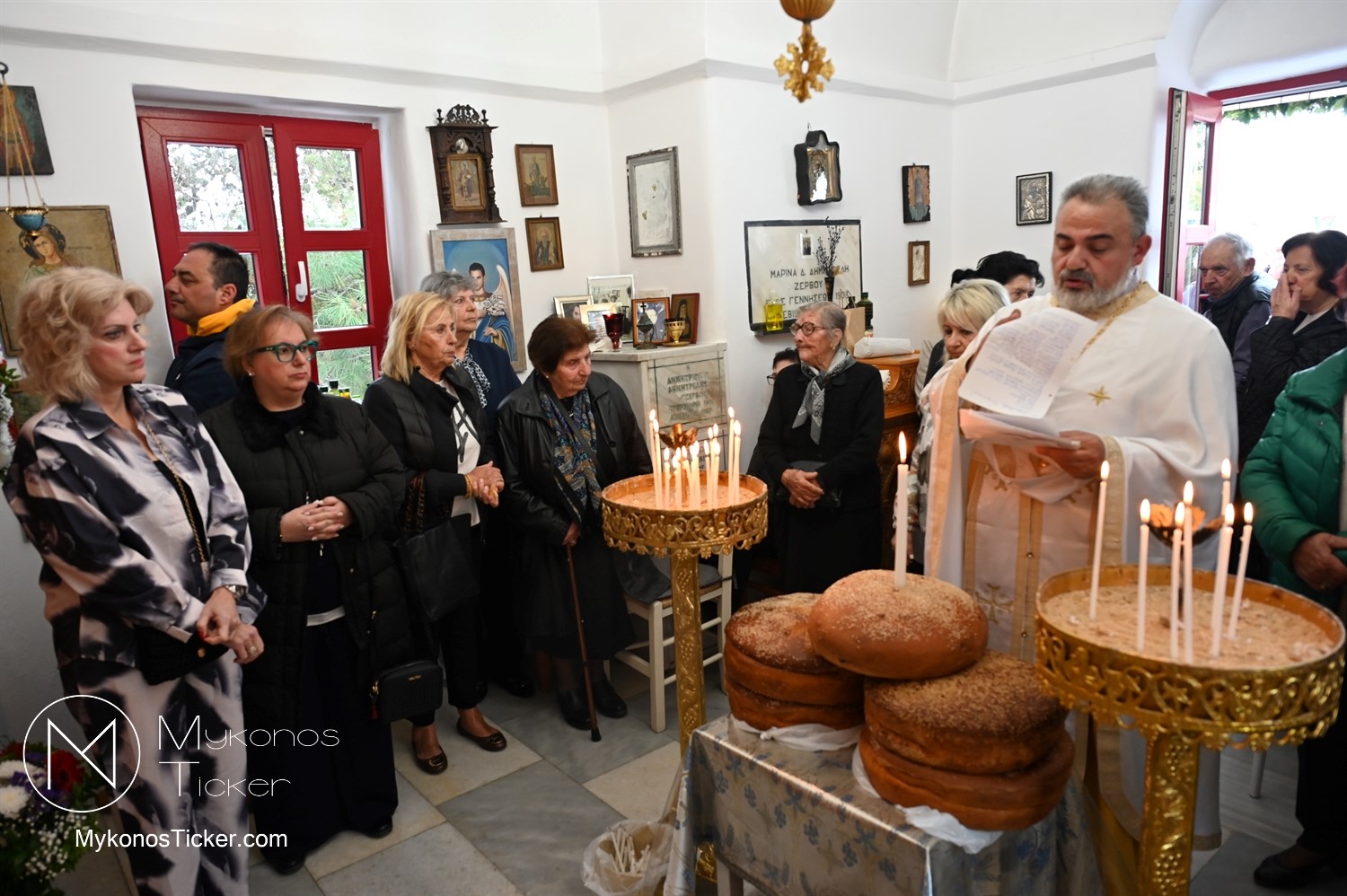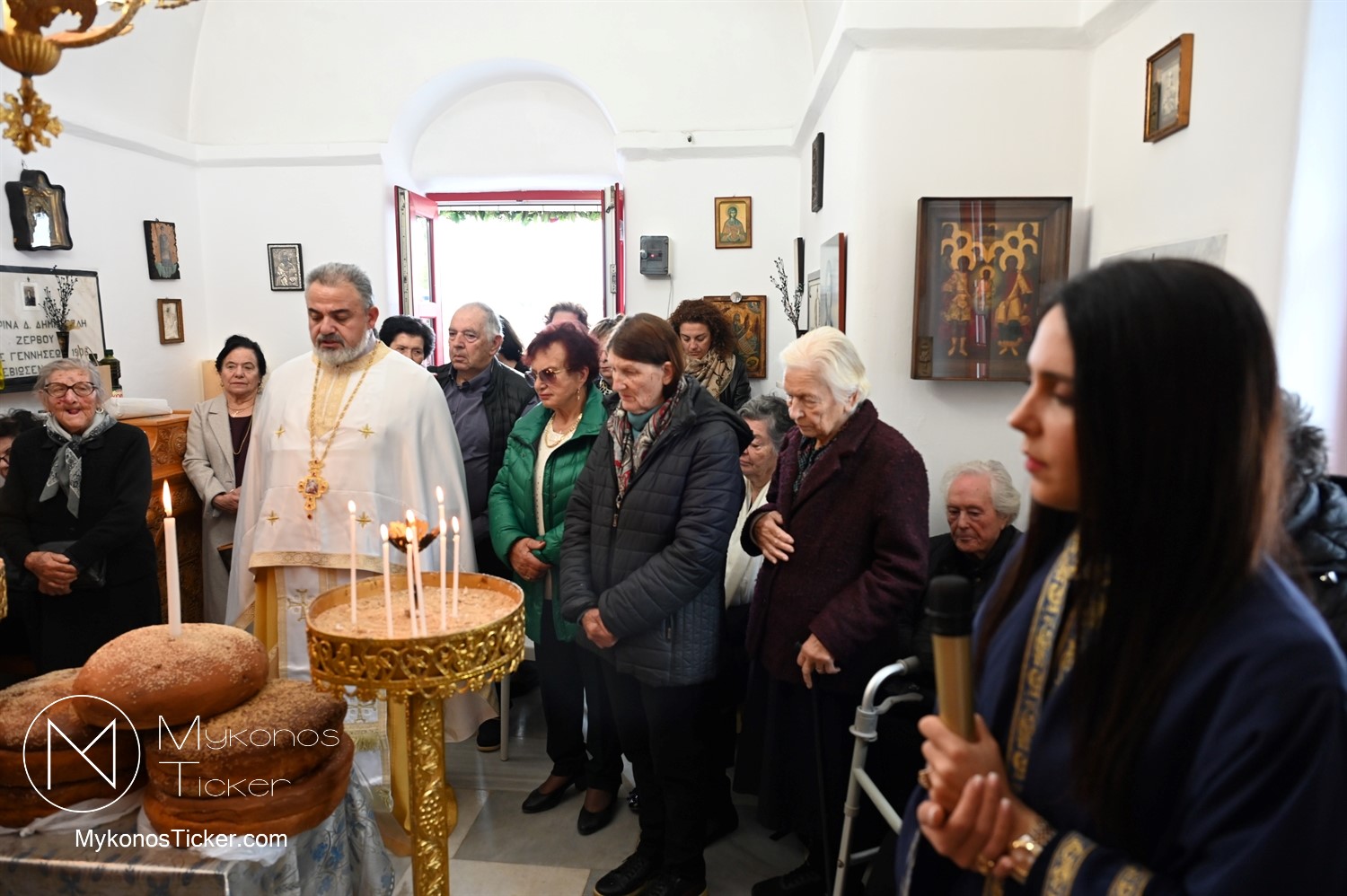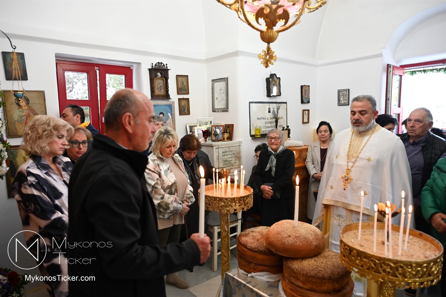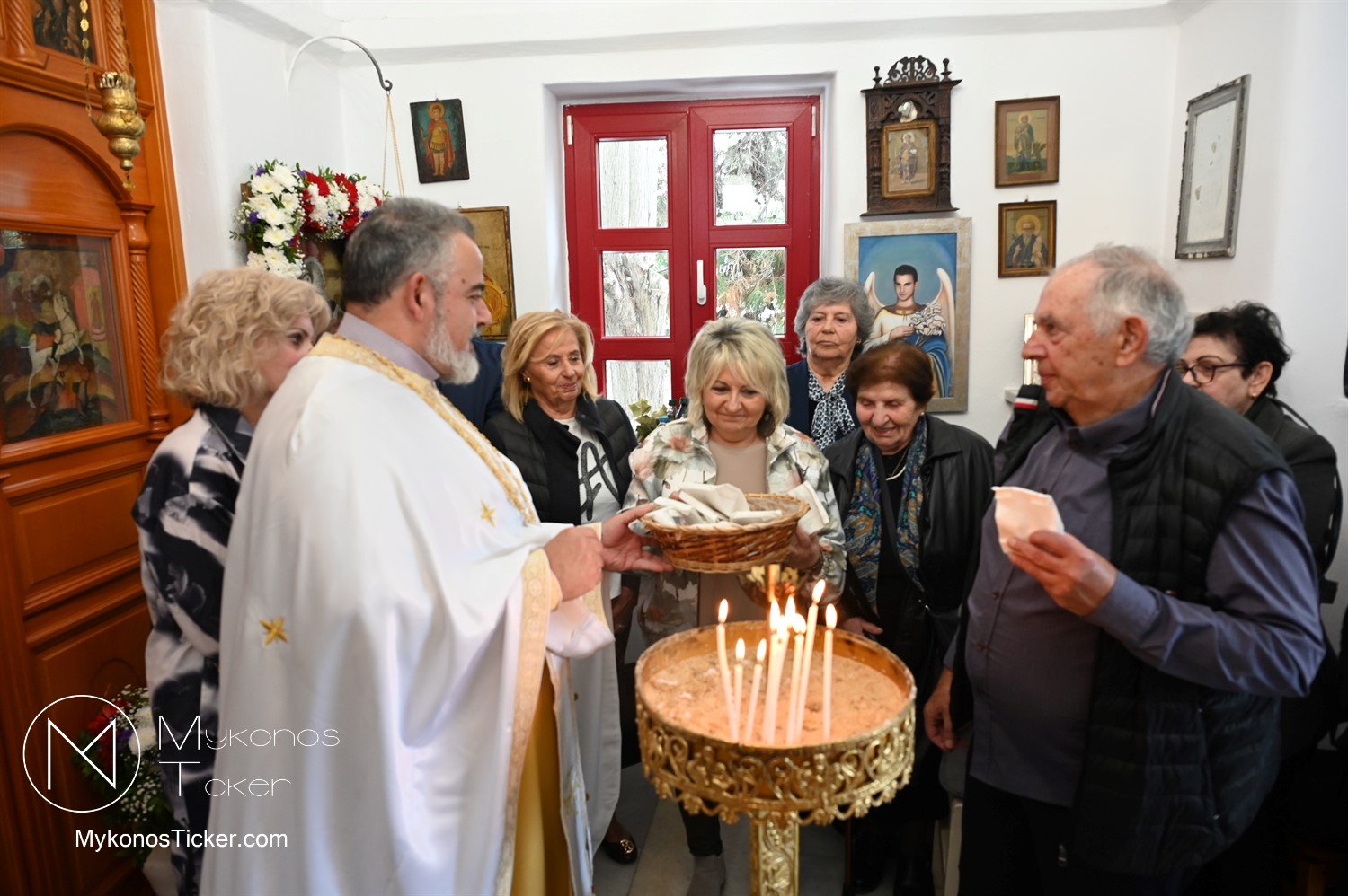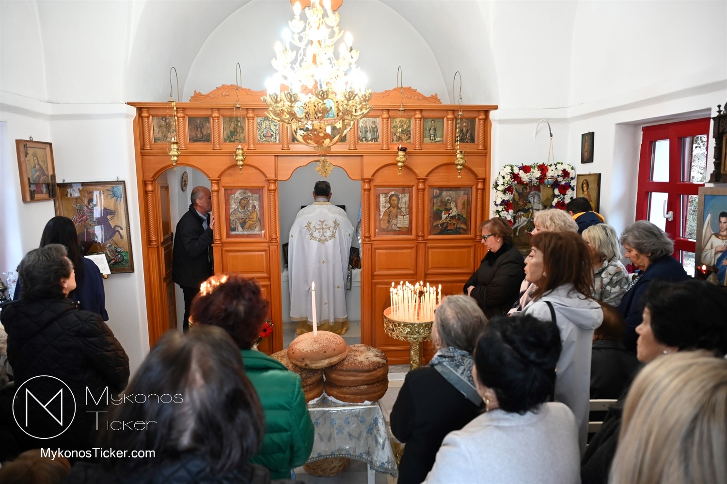 Ο μικρός μα πάνσεπτος ναός κατακλύστηκε από πλήθος Μυκονίων, οι οποίοι προσήλθαν με ευλάβεια για να αποθέσουν τον ασπασμό τους στον Άγιο των φτωχών, των κατατρεγμένων και των στρατιωτών. Ιδιαίτερη υπήρξε η συπροσευχητική παρουσία των αρχόντων του τόπου, οι οποίοι ενσωματώθηκαν ομοθυμαδόν στο Σώμα της Εκκλησίας. They attended Mykonos Mayor Christos Veronis, ο Αντιδήμαρχος Δημήτρης Κουτσούκος, καθώς και ο Δημοτικός Σύμβουλος και Πρόεδρος της ΔΕΥΑΜ Δημήτρης Λαζαρίδης, αποδεικνύοντας έμπρακτα τον άρρηκτο δεσμό των τοπικών θεσμών με την εκκλησιαστική ζωή του νησιού.