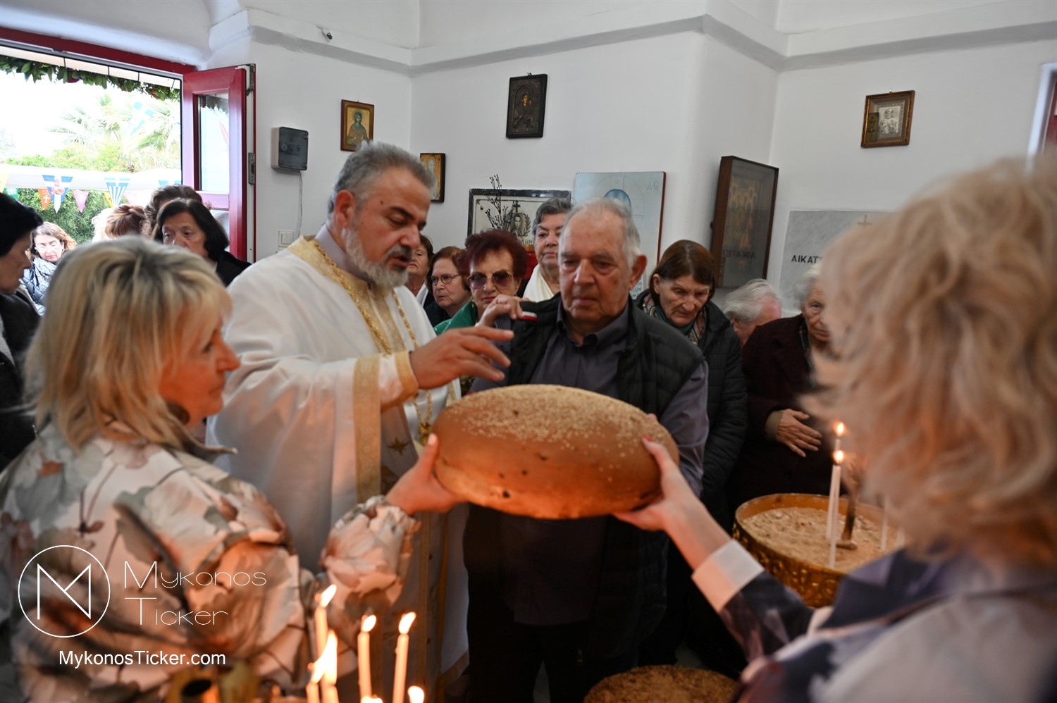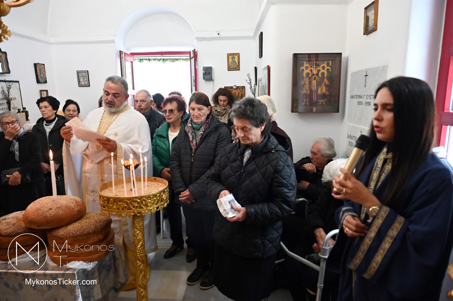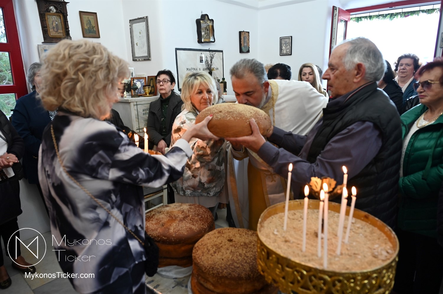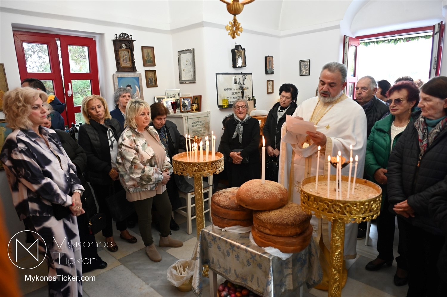 Ο μικρός μα πάνσεπτος ναός κατακλύστηκε από πλήθος Μυκονίων, οι οποίοι προσήλθαν με ευλάβεια για να αποθέσουν τον ασπασμό τους στον Άγιο των φτωχών, των κατατρεγμένων και των στρατιωτών. Ιδιαίτερη υπήρξε η συπροσευχητική παρουσία των αρχόντων του τόπου, οι οποίοι ενσωματώθηκαν ομοθυμαδόν στο Σώμα της Εκκλησίας. They attended Mykonos Mayor Christos Veronis, ο Αντιδήμαρχος Δημήτρης Κουτσούκος, καθώς και ο Δημοτικός Σύμβουλος και Πρόεδρος της ΔΕΥΑΜ Δημήτρης Λαζαρίδης, αποδεικνύοντας έμπρακτα τον άρρηκτο δεσμό των τοπικών θεσμών με την εκκλησιαστική ζωή του νησιού.