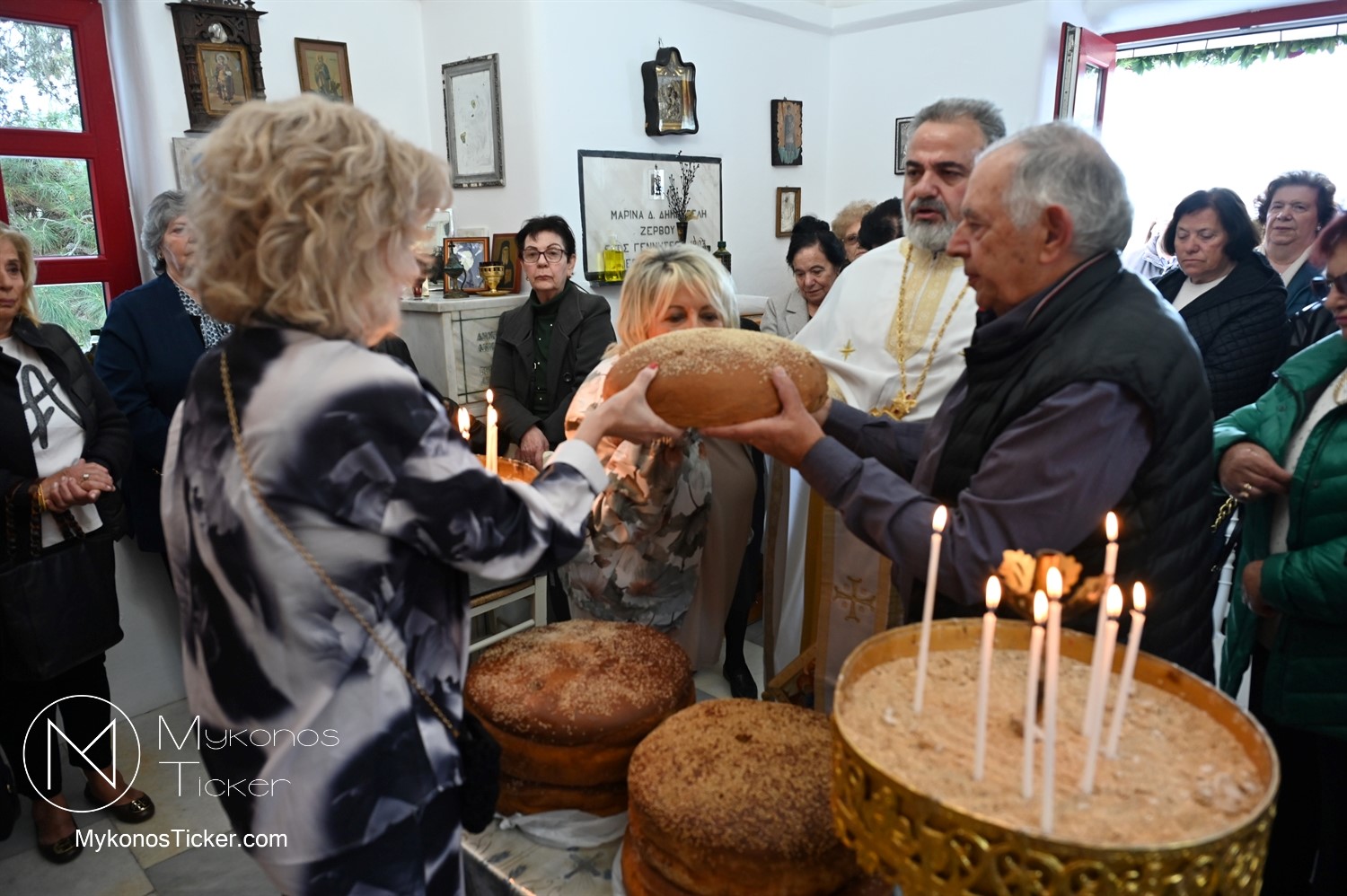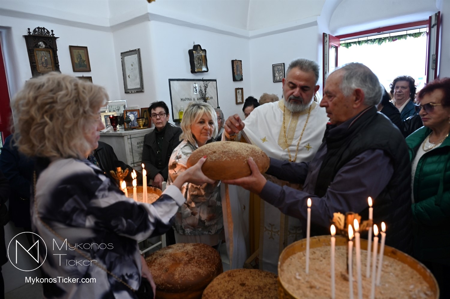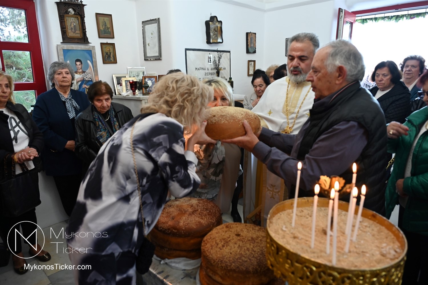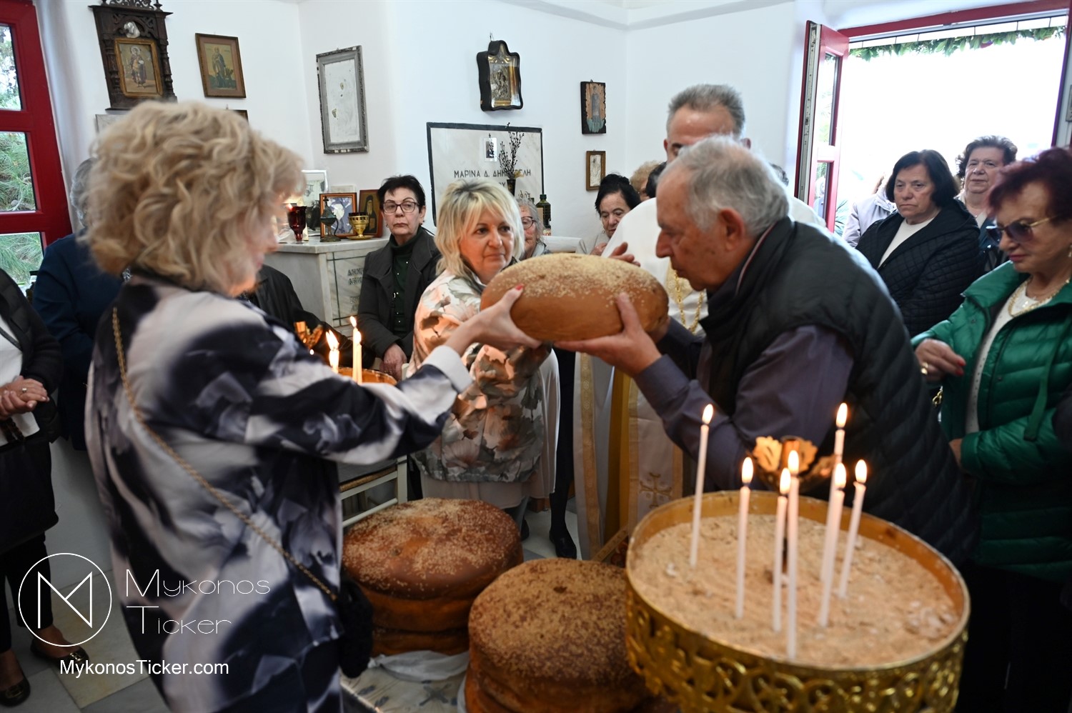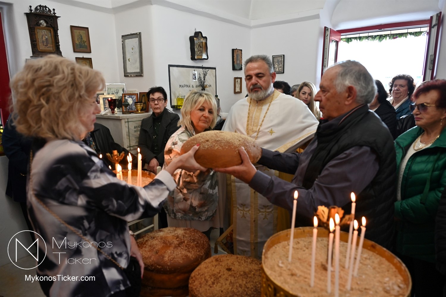 Ο μικρός μα πάνσεπτος ναός κατακλύστηκε από πλήθος Μυκονίων, οι οποίοι προσήλθαν με ευλάβεια για να αποθέσουν τον ασπασμό τους στον Άγιο των φτωχών, των κατατρεγμένων και των στρατιωτών. Ιδιαίτερη υπήρξε η συπροσευχητική παρουσία των αρχόντων του τόπου, οι οποίοι ενσωματώθηκαν ομοθυμαδόν στο Σώμα της Εκκλησίας. They attended Mykonos Mayor Christos Veronis, ο Αντιδήμαρχος Δημήτρης Κουτσούκος, καθώς και ο Δημοτικός Σύμβουλος και Πρόεδρος της ΔΕΥΑΜ Δημήτρης Λαζαρίδης, αποδεικνύοντας έμπρακτα τον άρρηκτο δεσμό των τοπικών θεσμών με την εκκλησιαστική ζωή του νησιού.