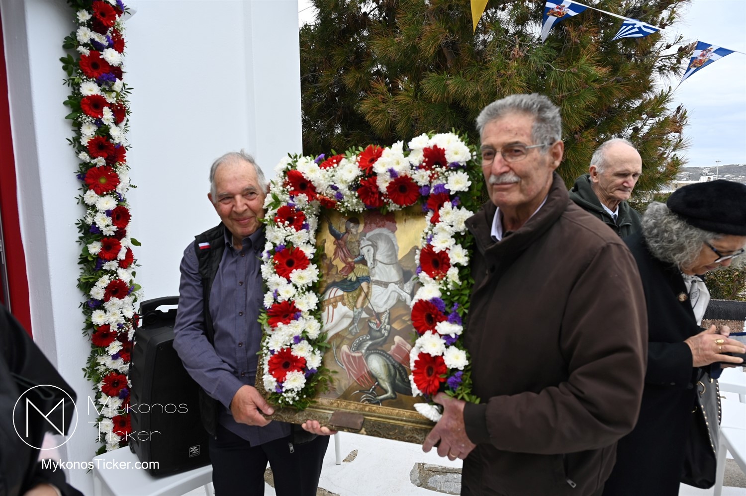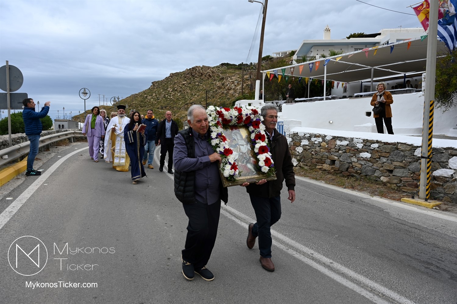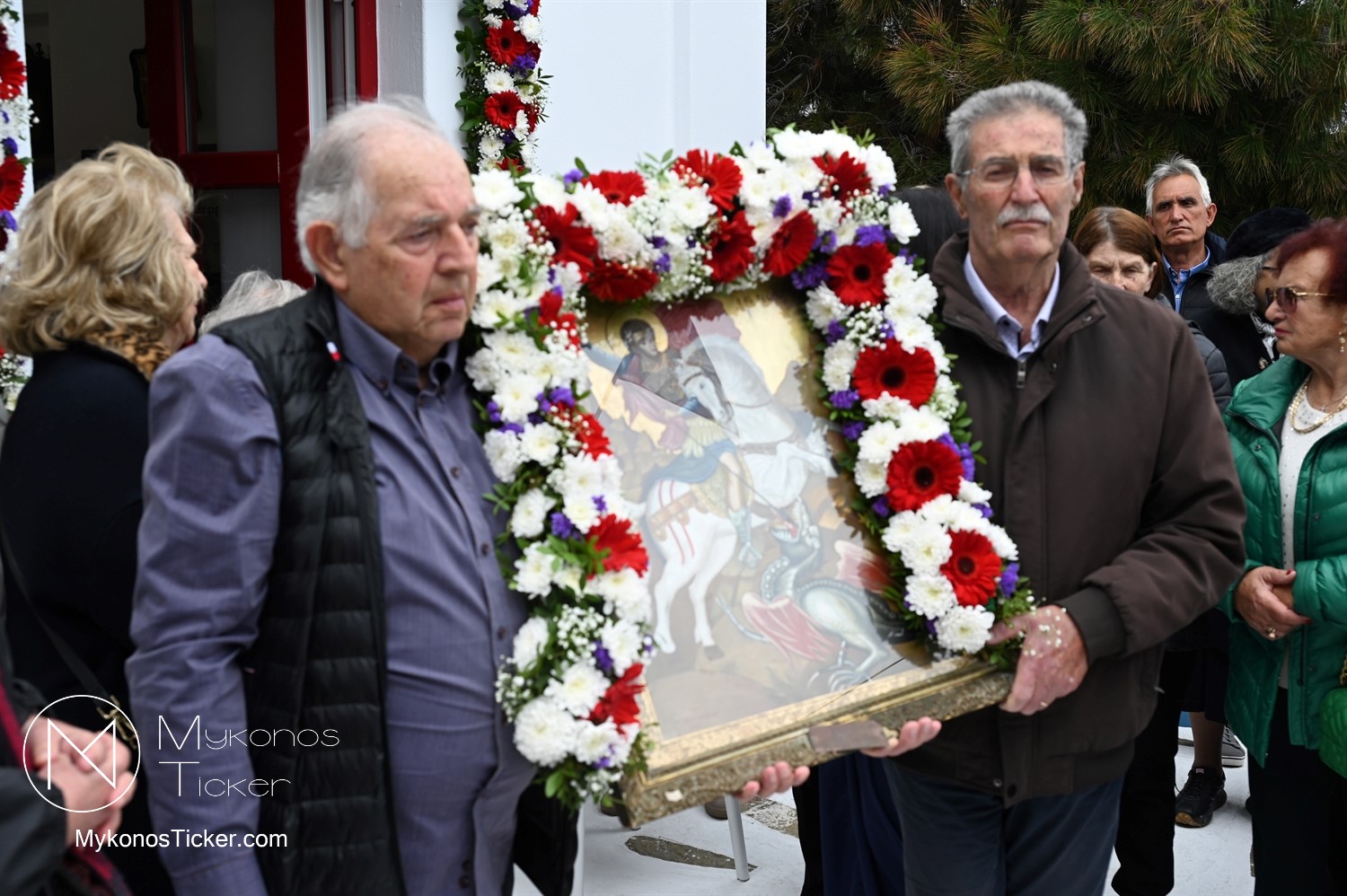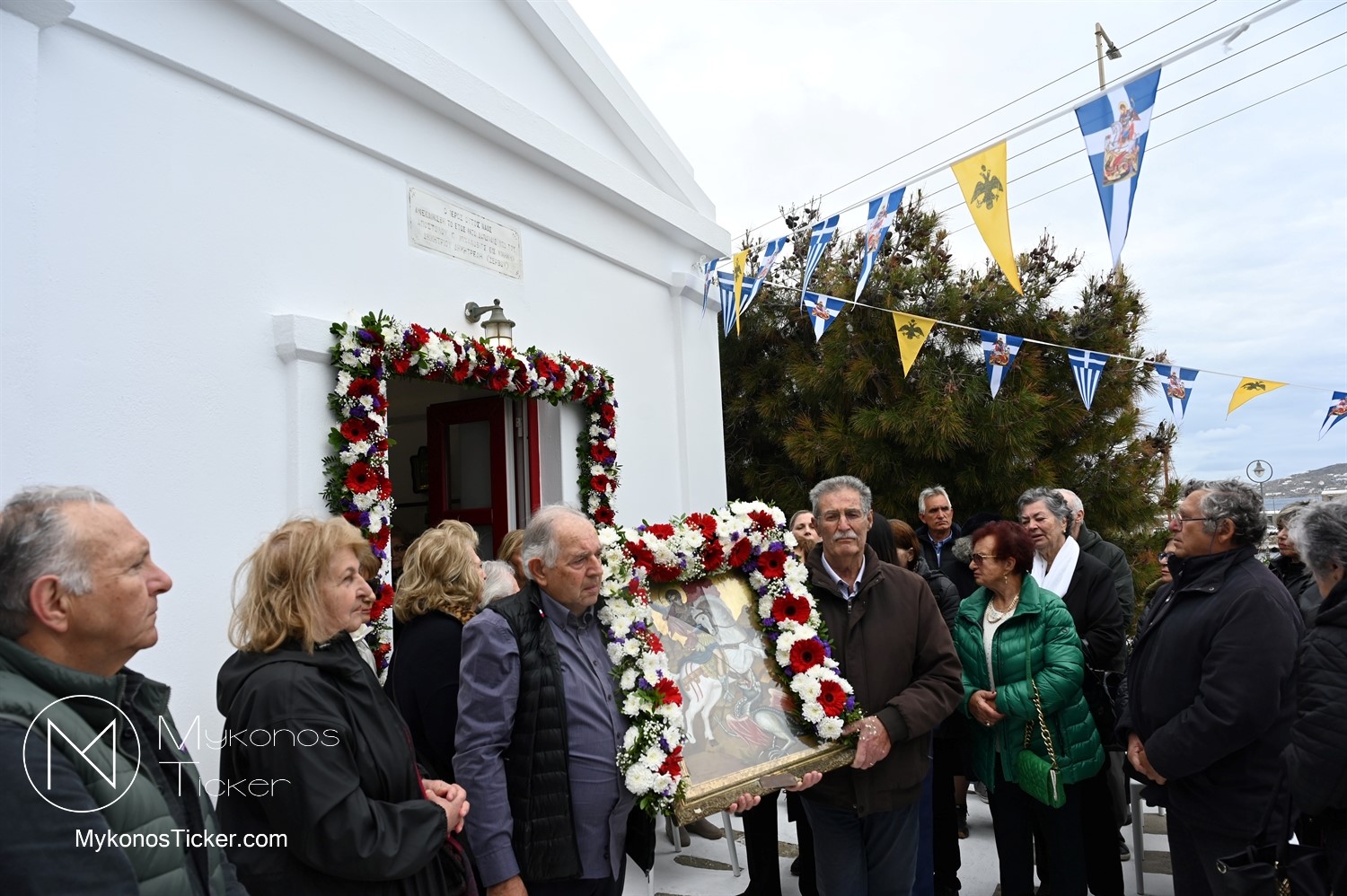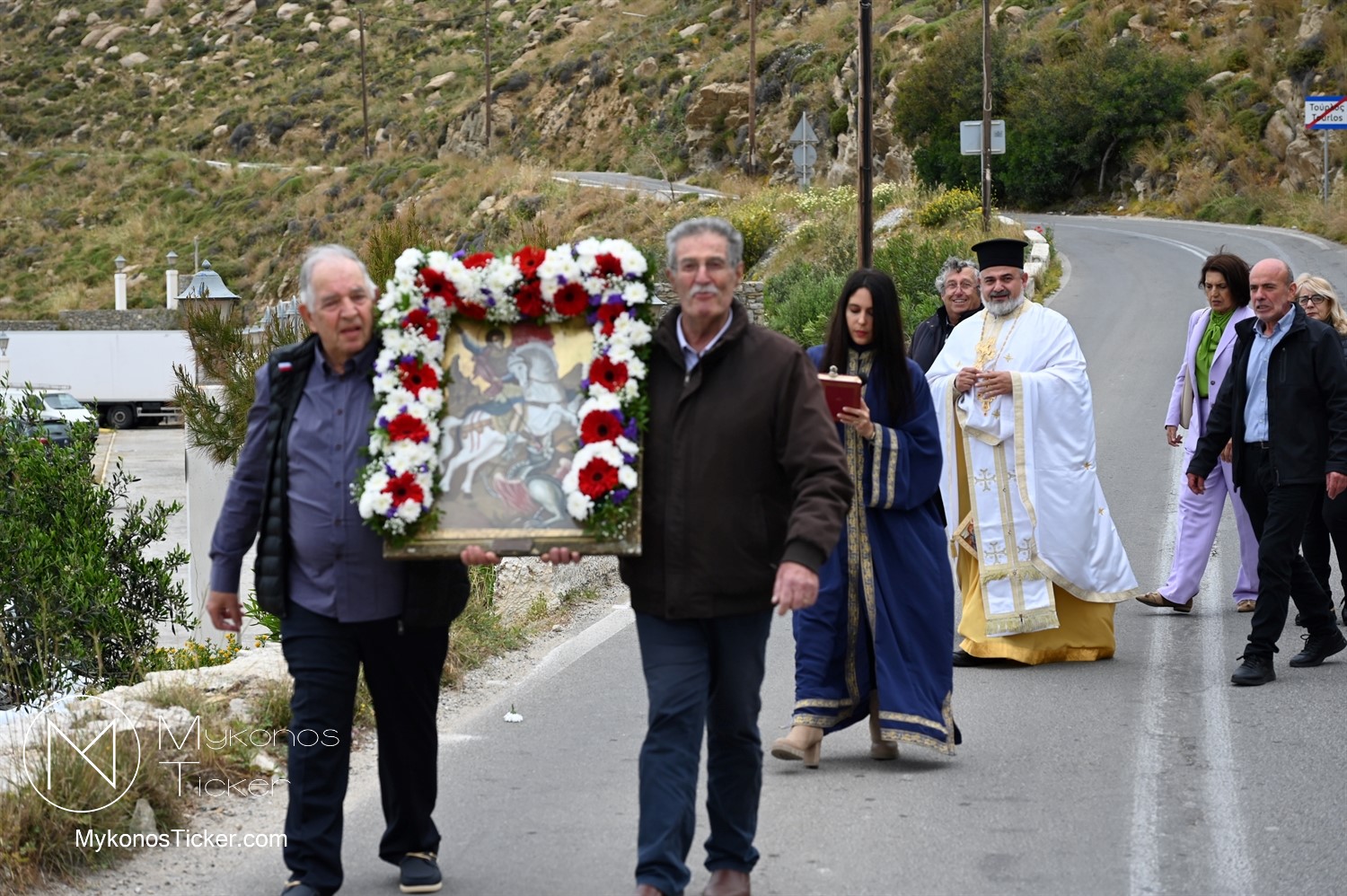 After the end of the Divine Liturgy, υπό τους ήχους των εορταστικών κωδωνοκρουσιών και με τη θαλασσινή αύρα να συνοδεύει τα βήματα των πιστών, έλαβε χώρα η περιφορά της περίπυστης Ιεράς Εικόνας του Αγίου Γεωργίου πέριξ του παρεκκλησίου. Στολισμένη με ένα περίτεχνο στεφάνι από ερυθρά και λευκά άνθη, η εικόνα βαστάχτηκε στα χέρια ευλαβών Μυκονίων, ευλογώντας τον αέρα, τη γη και τα ύδατα του Τούρλου, επισφραγίζοντας την παρουσία του Μεγαλομάρτυρος ως άγρυπνου φρουρού του νησιού. Οι γαλανόλευκες και βυζαντινές σημαίες κυμάτιζαν περήφανα, συνθέτοντας ένα κάδρο απαράμιλλης ελληνορθόδοξης αισθητικής.