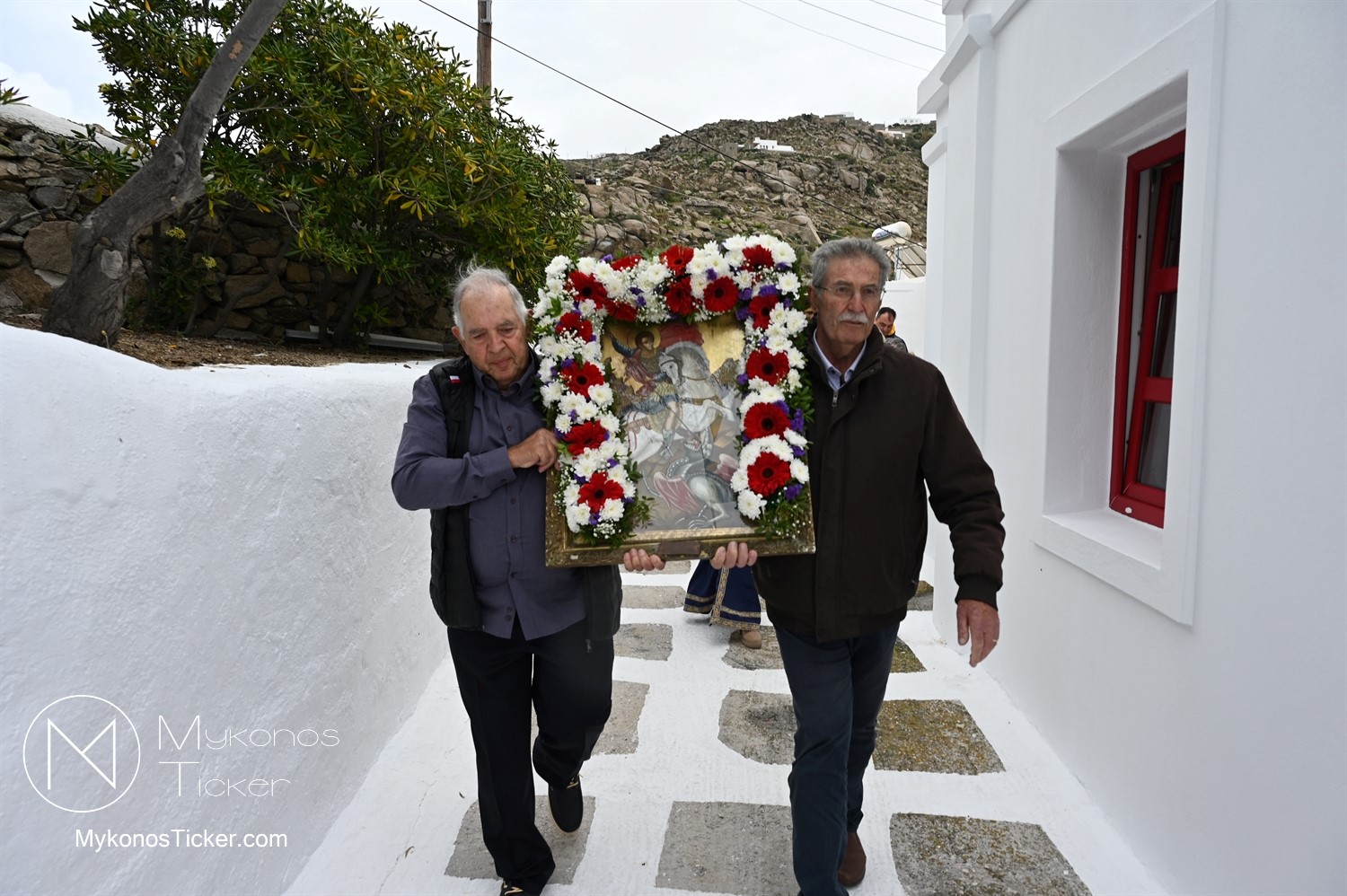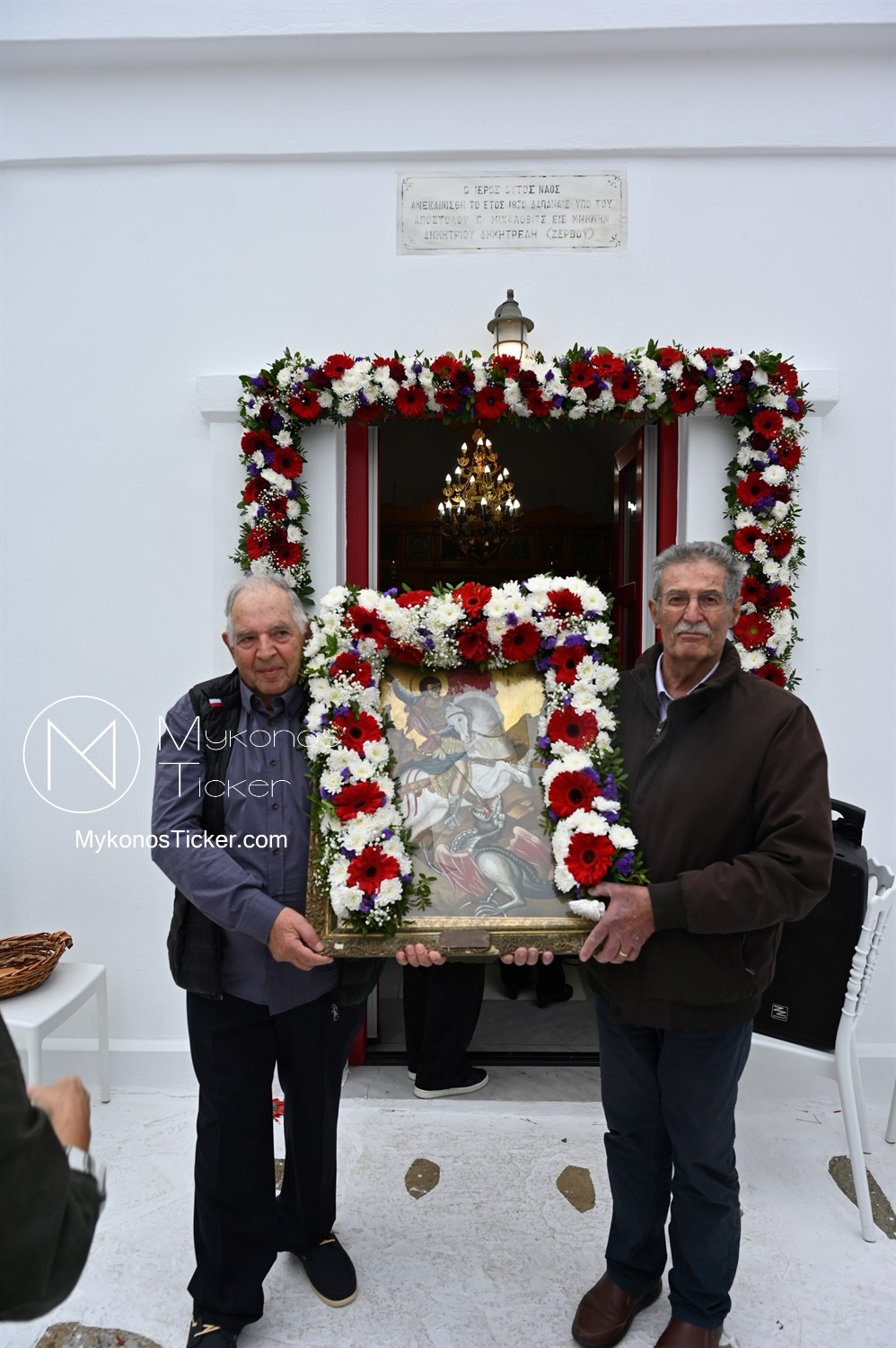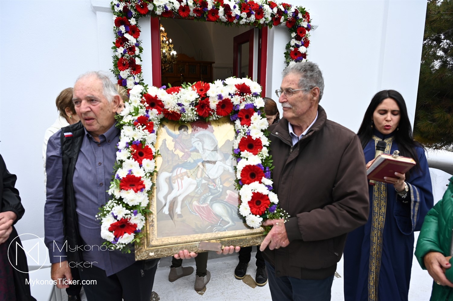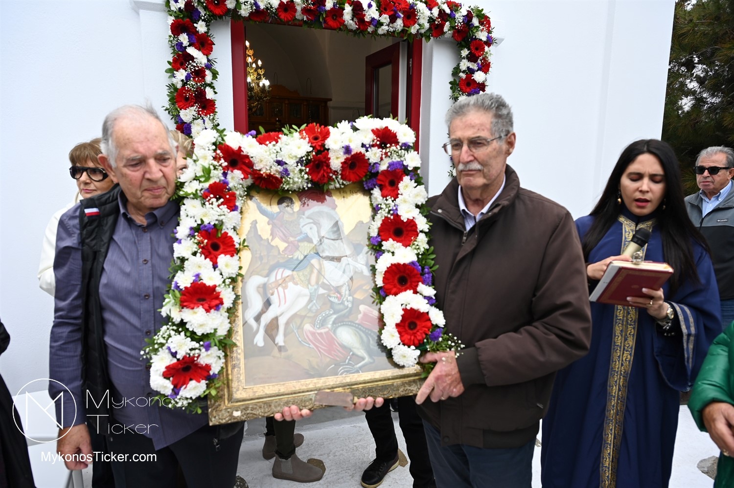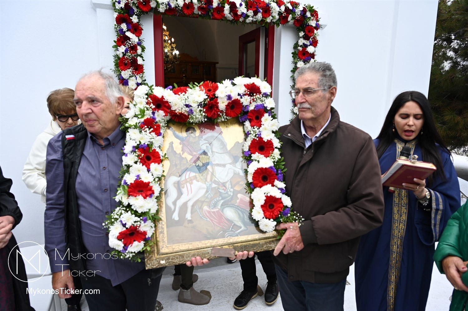After the end of the Divine Liturgy, υπό τους ήχους των εορταστικών κωδωνοκρουσιών και με τη θαλασσινή αύρα να συνοδεύει τα βήματα των πιστών, έλαβε χώρα η περιφορά της περίπυστης Ιεράς Εικόνας του Αγίου Γεωργίου πέριξ του παρεκκλησίου. Στολισμένη με ένα περίτεχνο στεφάνι από ερυθρά και λευκά άνθη, η εικόνα βαστάχτηκε στα χέρια ευλαβών Μυκονίων, ευλογώντας τον αέρα, τη γη και τα ύδατα του Τούρλου, επισφραγίζοντας την παρουσία του Μεγαλομάρτυρος ως άγρυπνου φρουρού του νησιού. Οι γαλανόλευκες και βυζαντινές σημαίες κυμάτιζαν περήφανα, συνθέτοντας ένα κάδρο απαράμιλλης ελληνορθόδοξης αισθητικής.