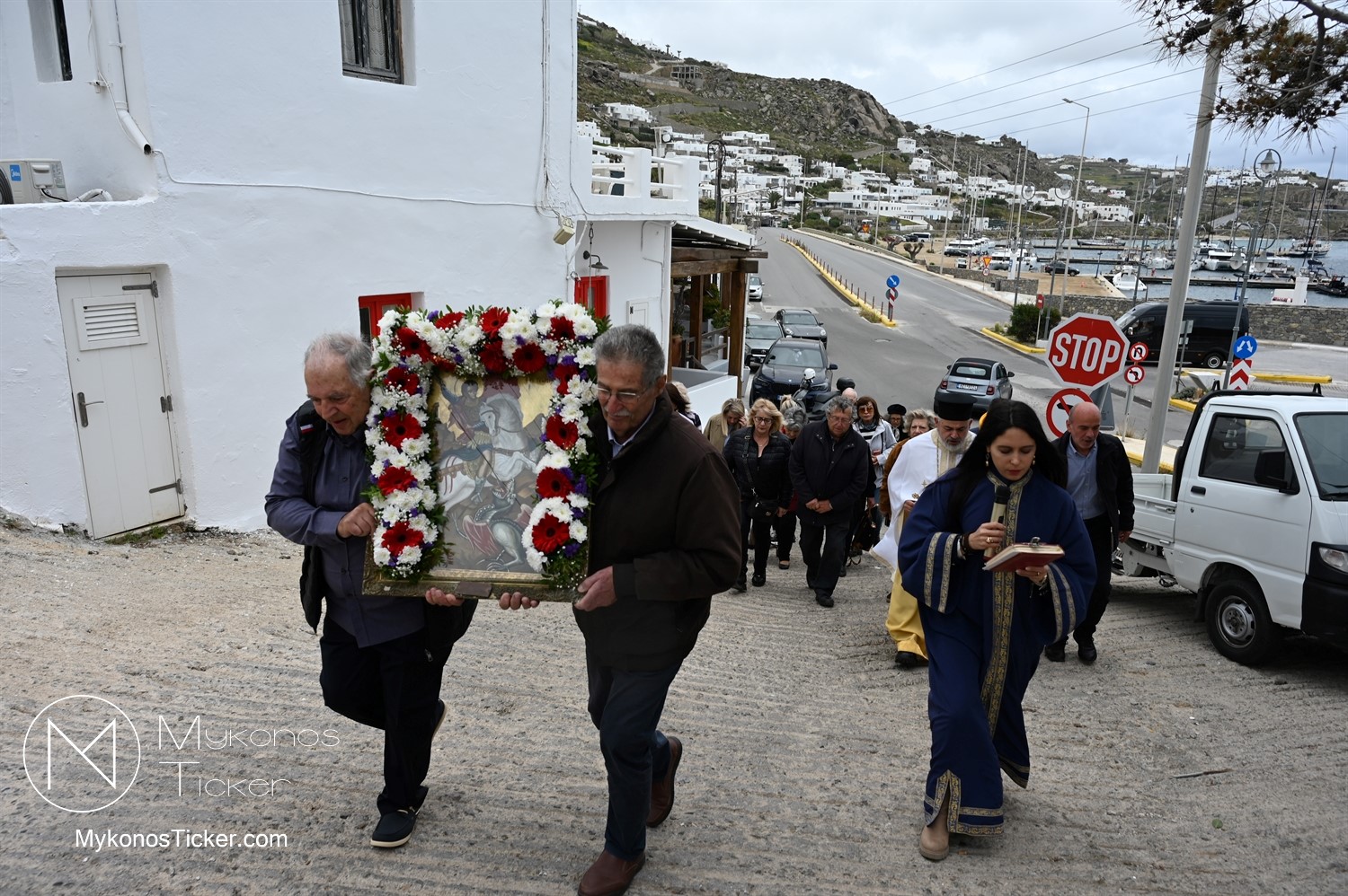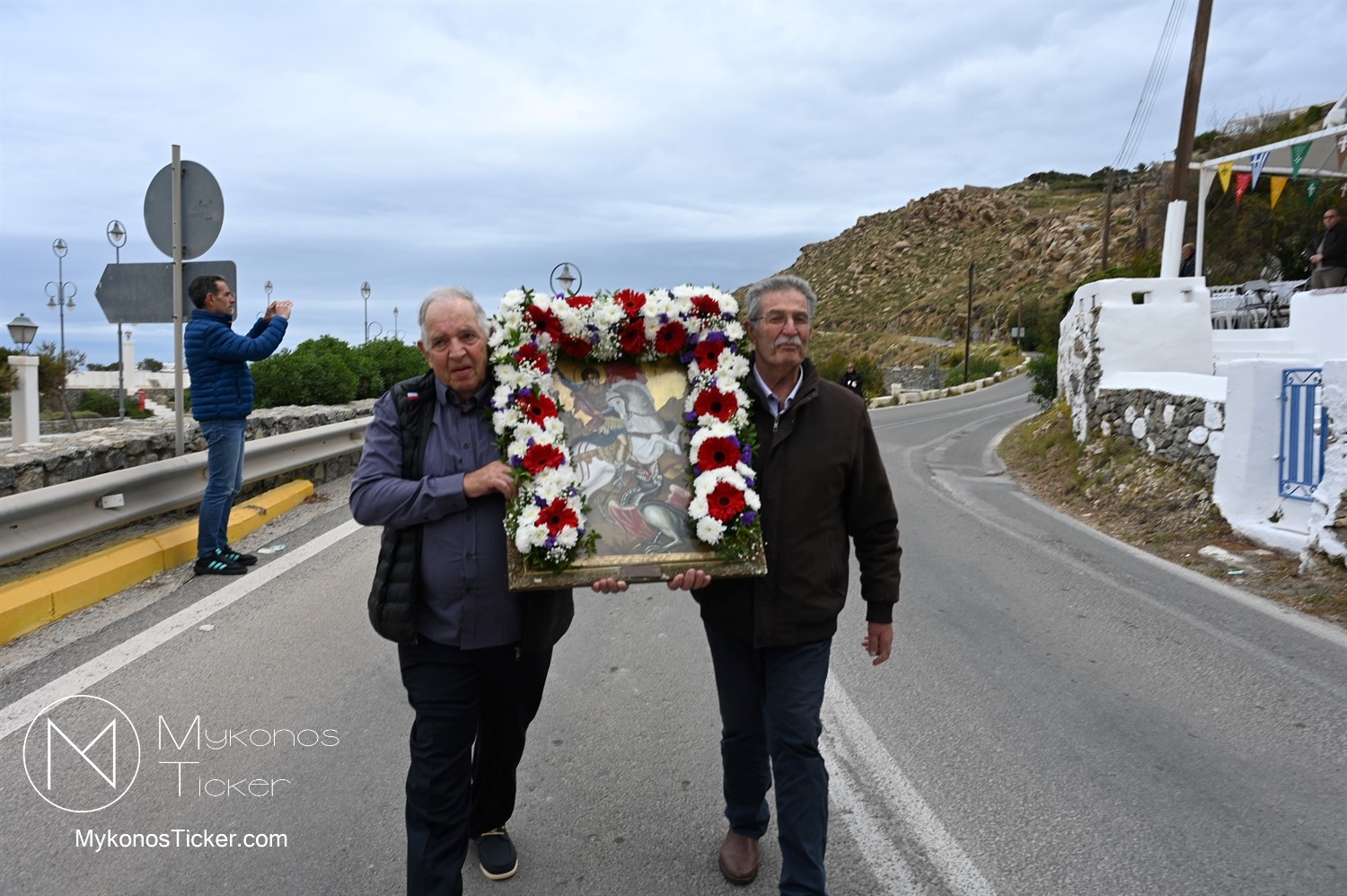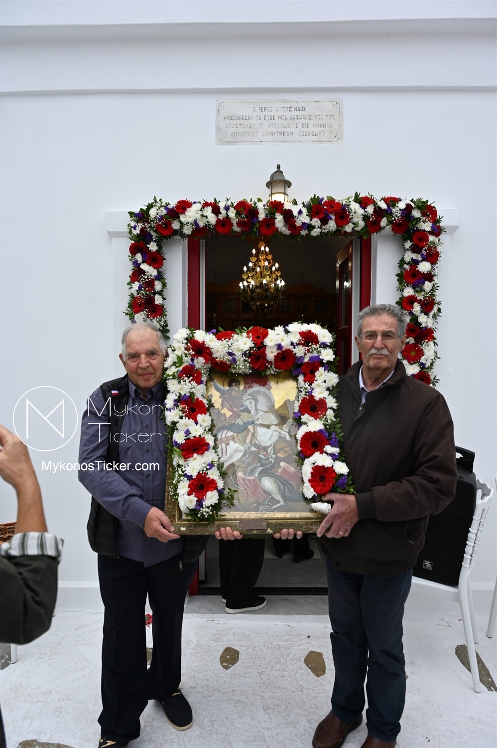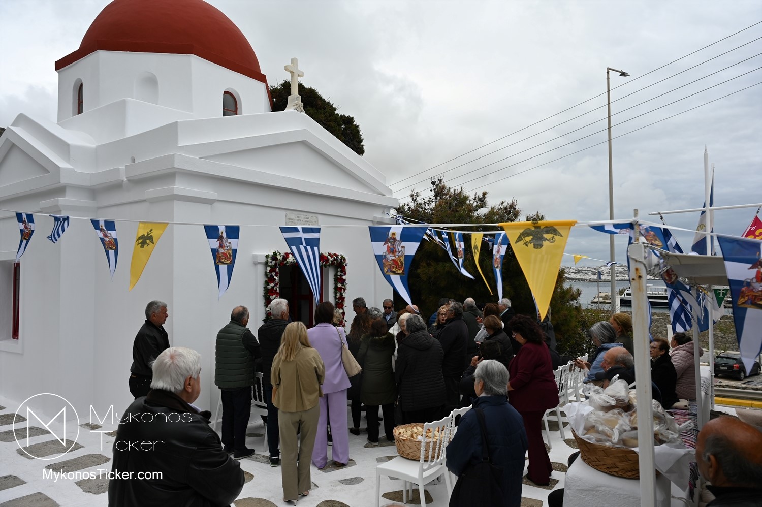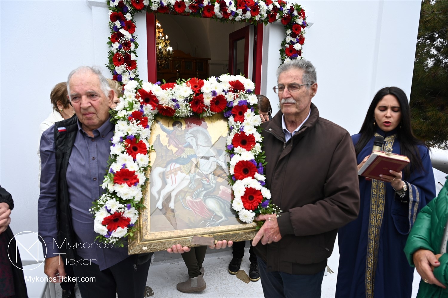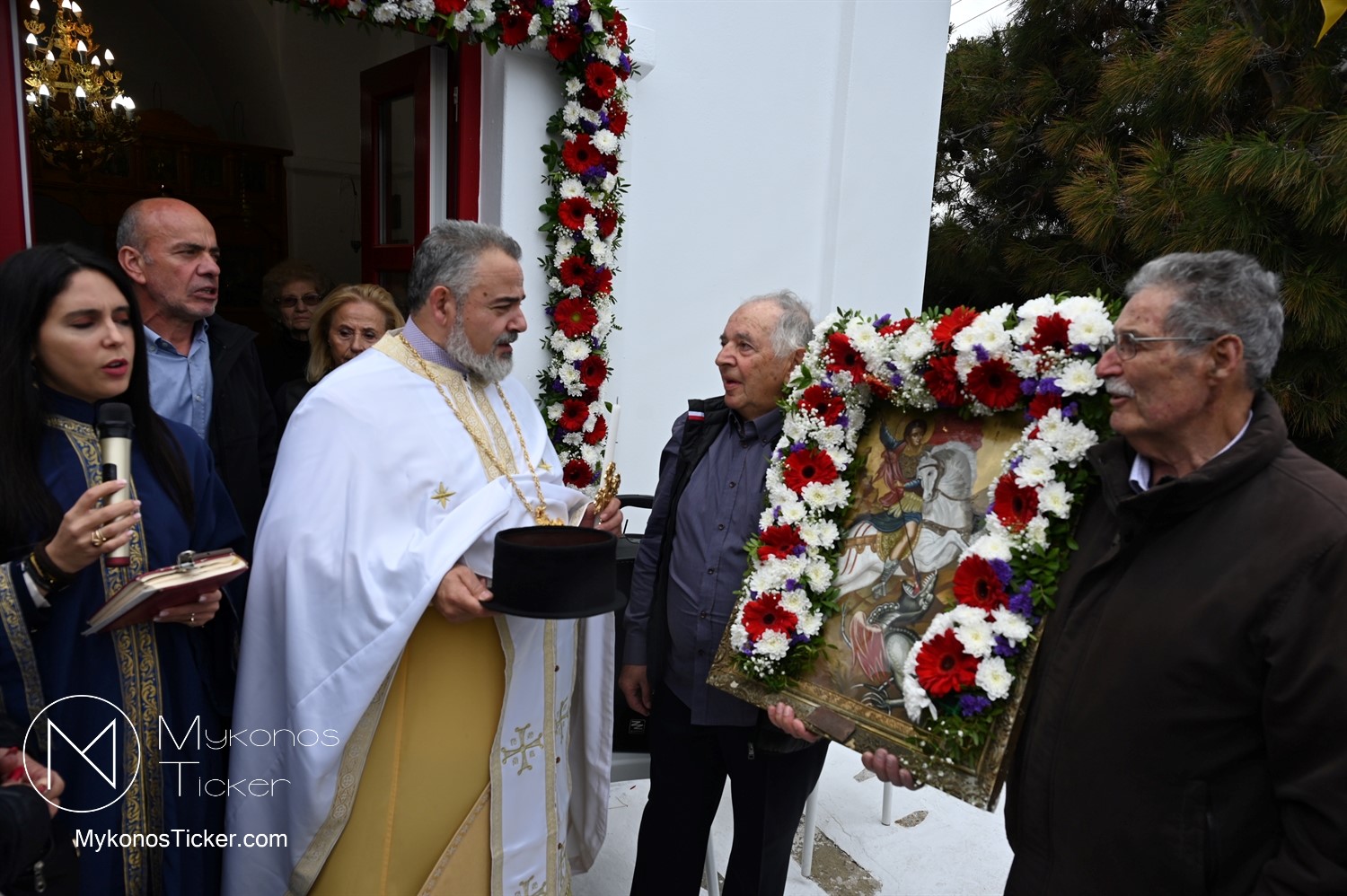 After the end of the Divine Liturgy, υπό τους ήχους των εορταστικών κωδωνοκρουσιών και με τη θαλασσινή αύρα να συνοδεύει τα βήματα των πιστών, έλαβε χώρα η περιφορά της περίπυστης Ιεράς Εικόνας του Αγίου Γεωργίου πέριξ του παρεκκλησίου. Στολισμένη με ένα περίτεχνο στεφάνι από ερυθρά και λευκά άνθη, η εικόνα βαστάχτηκε στα χέρια ευλαβών Μυκονίων, ευλογώντας τον αέρα, τη γη και τα ύδατα του Τούρλου, επισφραγίζοντας την παρουσία του Μεγαλομάρτυρος ως άγρυπνου φρουρού του νησιού. Οι γαλανόλευκες και βυζαντινές σημαίες κυμάτιζαν περήφανα, συνθέτοντας ένα κάδρο απαράμιλλης ελληνορθόδοξης αισθητικής.