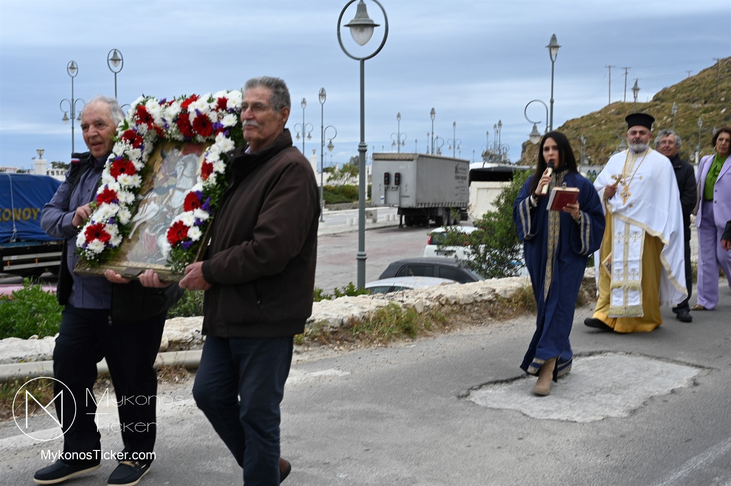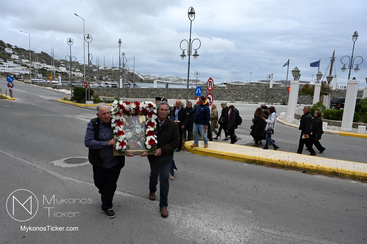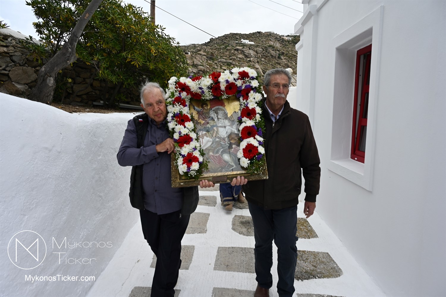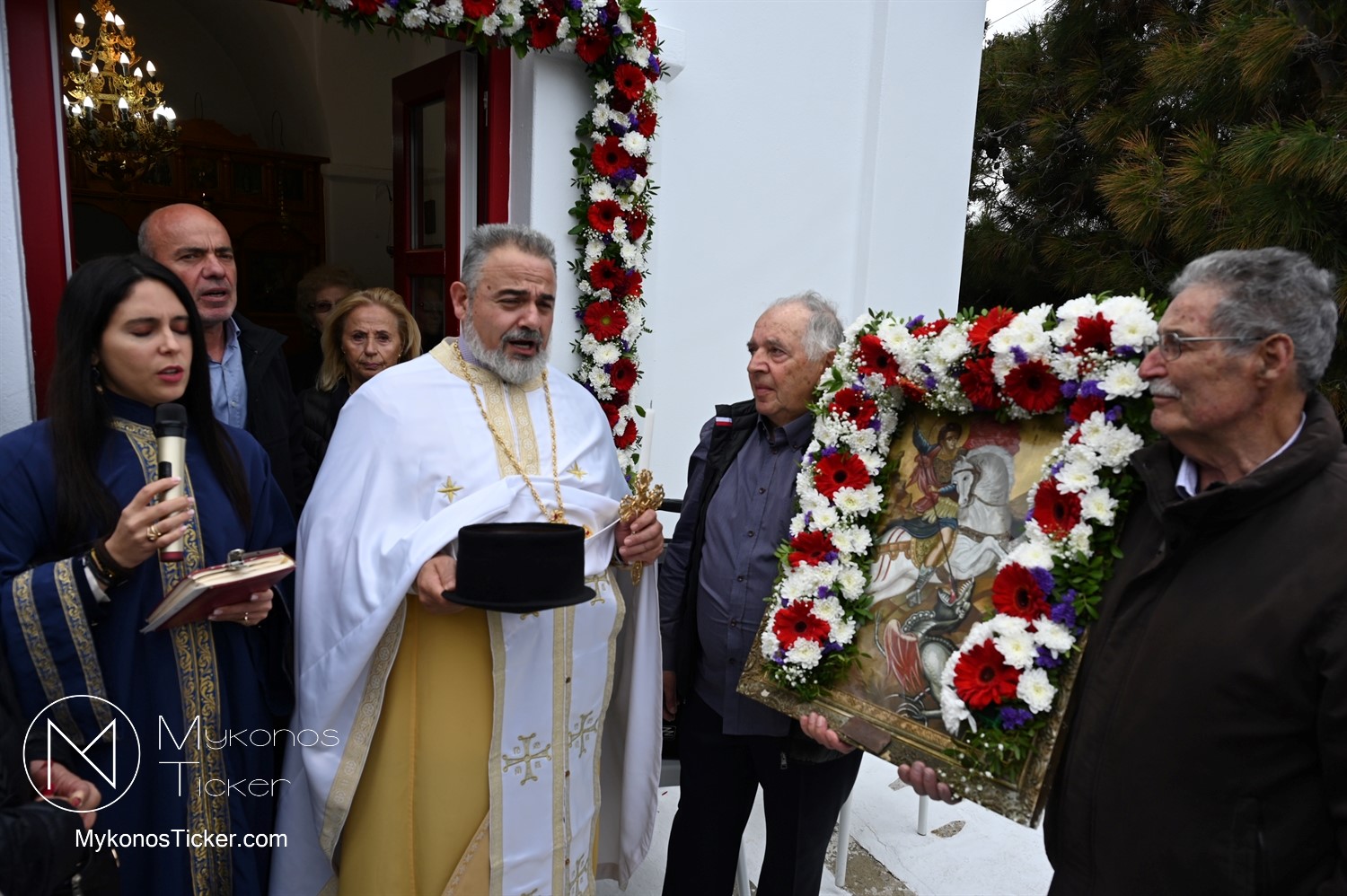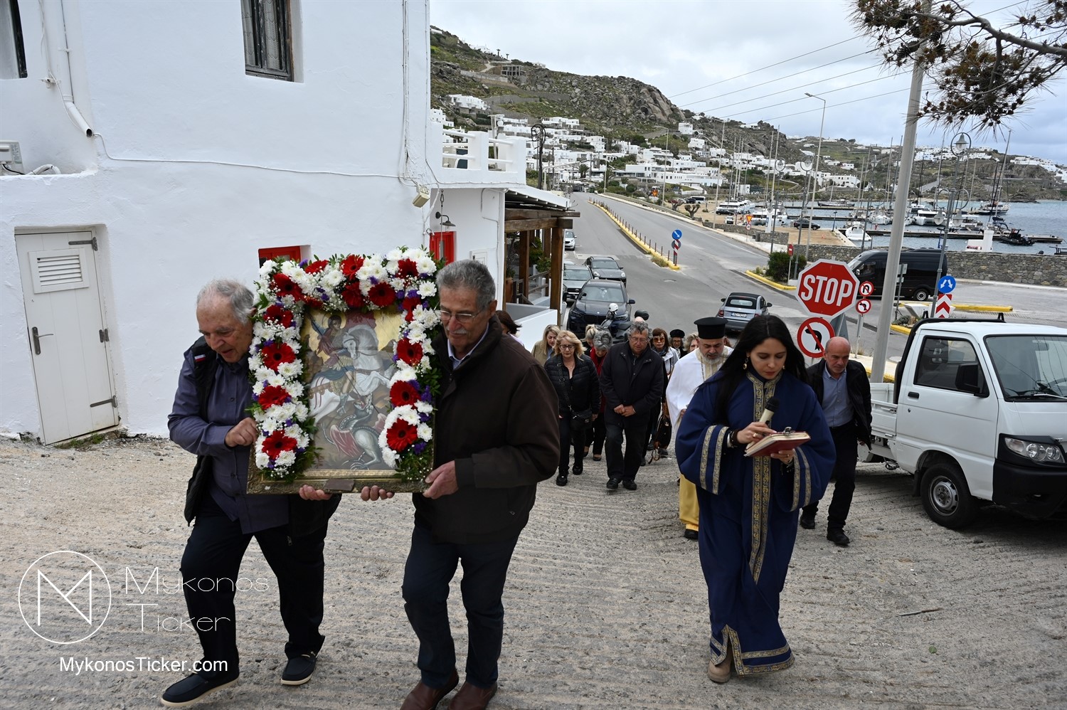 After the end of the Divine Liturgy, υπό τους ήχους των εορταστικών κωδωνοκρουσιών και με τη θαλασσινή αύρα να συνοδεύει τα βήματα των πιστών, έλαβε χώρα η περιφορά της περίπυστης Ιεράς Εικόνας του Αγίου Γεωργίου πέριξ του παρεκκλησίου. Στολισμένη με ένα περίτεχνο στεφάνι από ερυθρά και λευκά άνθη, η εικόνα βαστάχτηκε στα χέρια ευλαβών Μυκονίων, ευλογώντας τον αέρα, τη γη και τα ύδατα του Τούρλου, επισφραγίζοντας την παρουσία του Μεγαλομάρτυρος ως άγρυπνου φρουρού του νησιού. Οι γαλανόλευκες και βυζαντινές σημαίες κυμάτιζαν περήφανα, συνθέτοντας ένα κάδρο απαράμιλλης ελληνορθόδοξης αισθητικής.