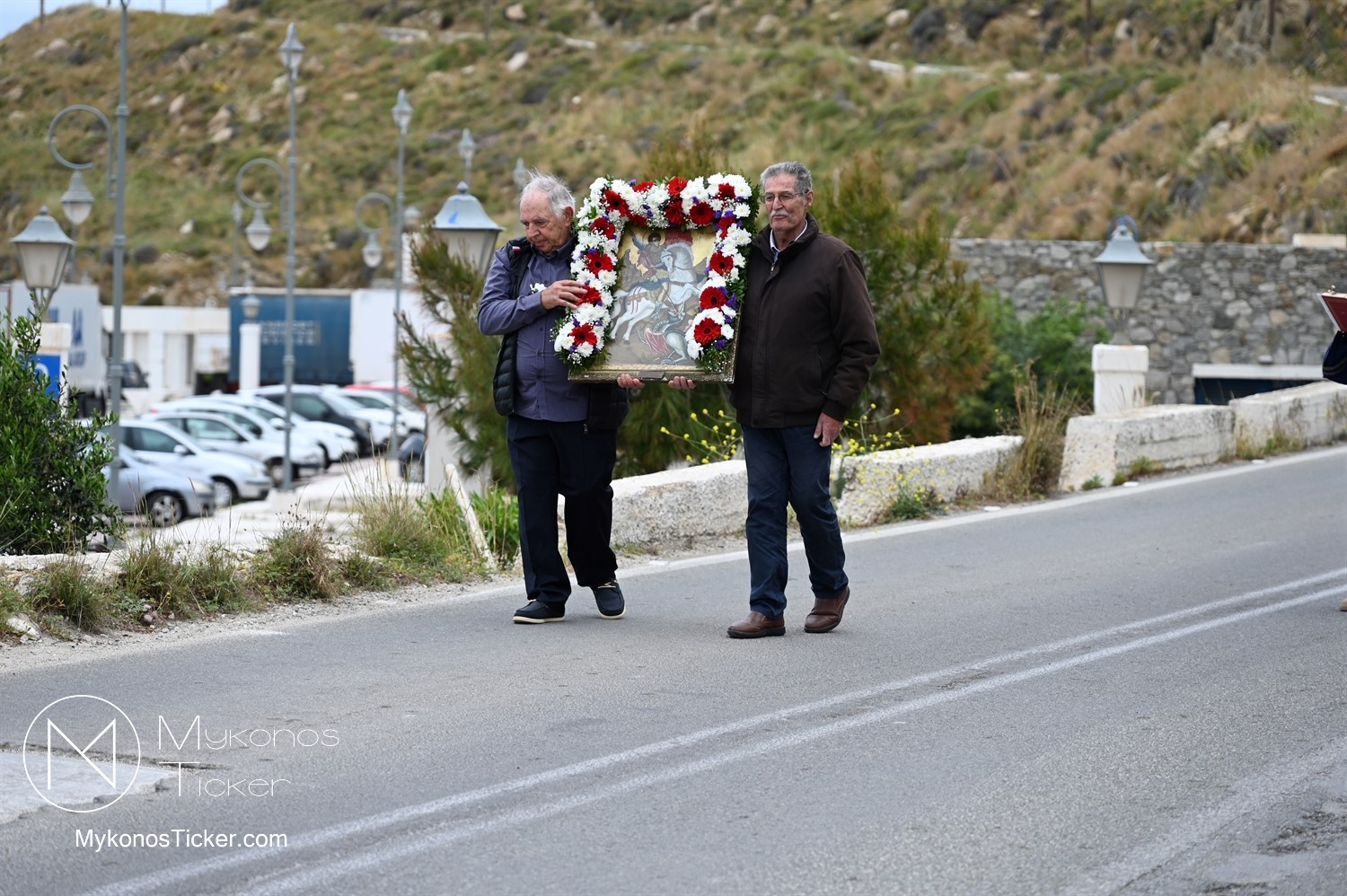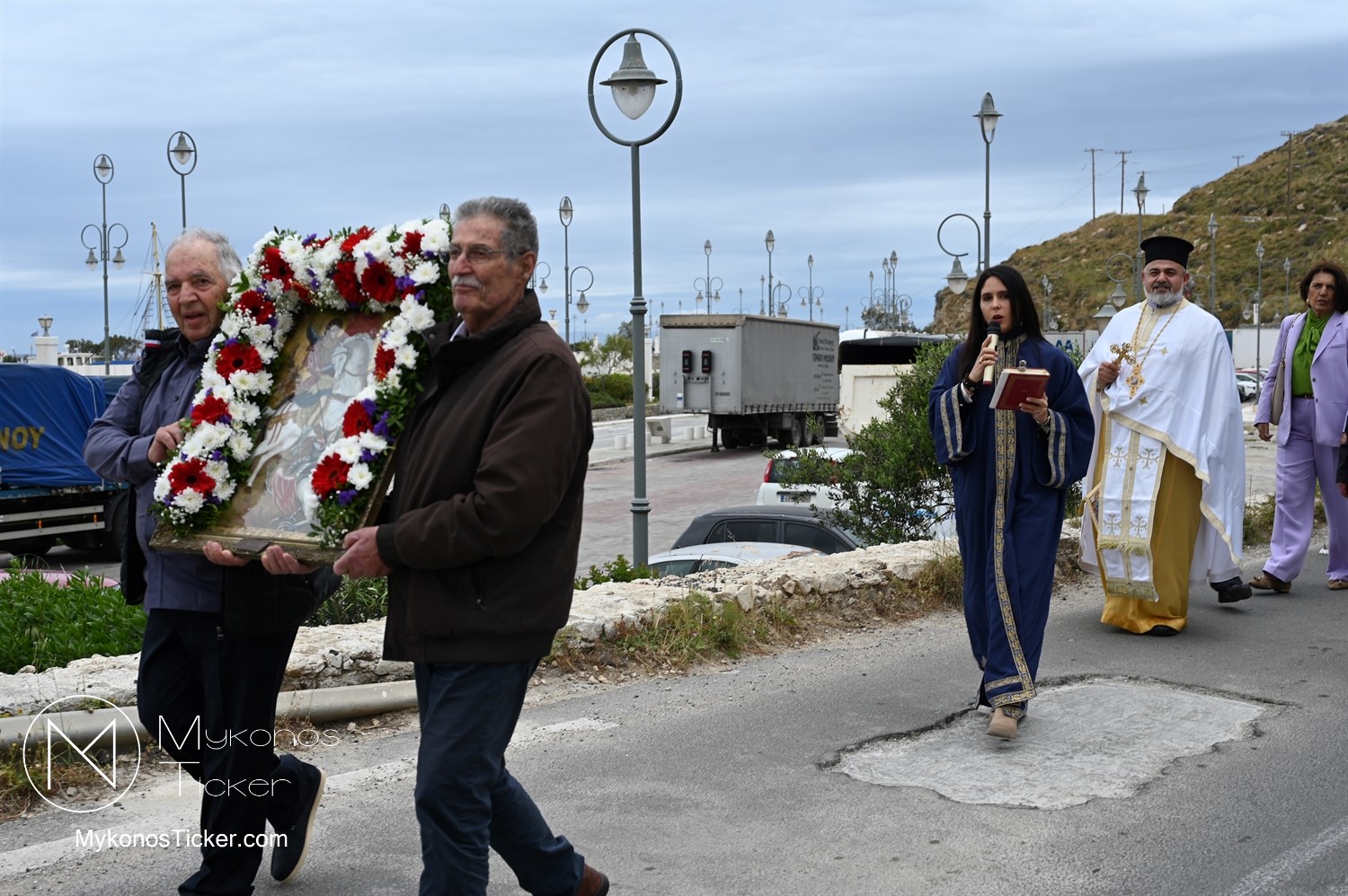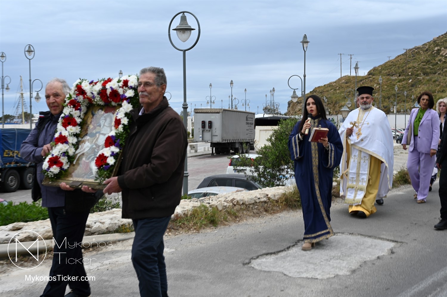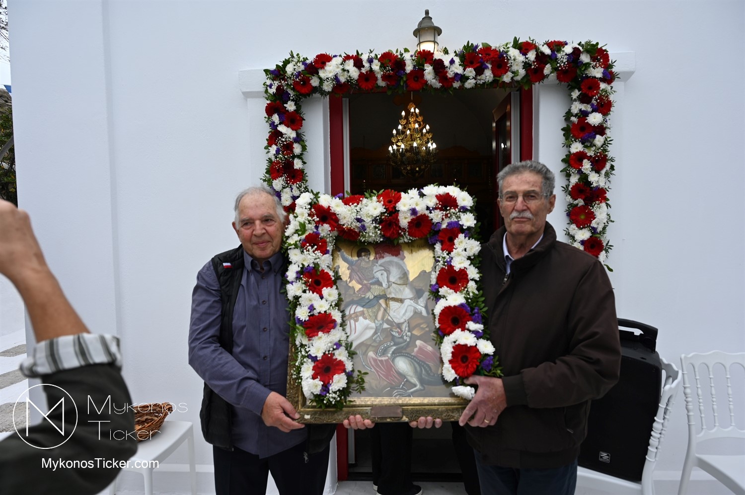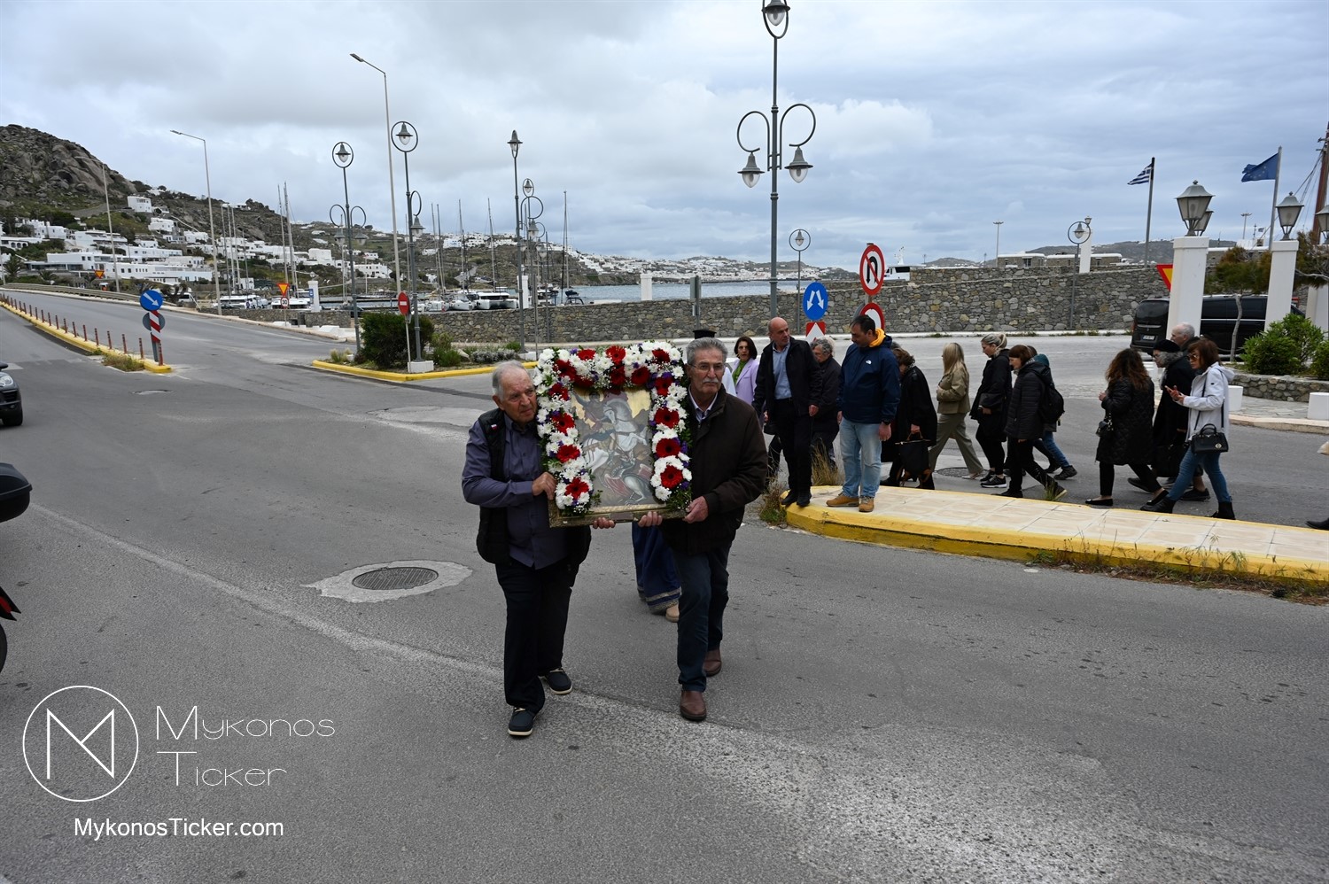 After the end of the Divine Liturgy, υπό τους ήχους των εορταστικών κωδωνοκρουσιών και με τη θαλασσινή αύρα να συνοδεύει τα βήματα των πιστών, έλαβε χώρα η περιφορά της περίπυστης Ιεράς Εικόνας του Αγίου Γεωργίου πέριξ του παρεκκλησίου. Στολισμένη με ένα περίτεχνο στεφάνι από ερυθρά και λευκά άνθη, η εικόνα βαστάχτηκε στα χέρια ευλαβών Μυκονίων, ευλογώντας τον αέρα, τη γη και τα ύδατα του Τούρλου, επισφραγίζοντας την παρουσία του Μεγαλομάρτυρος ως άγρυπνου φρουρού του νησιού. Οι γαλανόλευκες και βυζαντινές σημαίες κυμάτιζαν περήφανα, συνθέτοντας ένα κάδρο απαράμιλλης ελληνορθόδοξης αισθητικής.