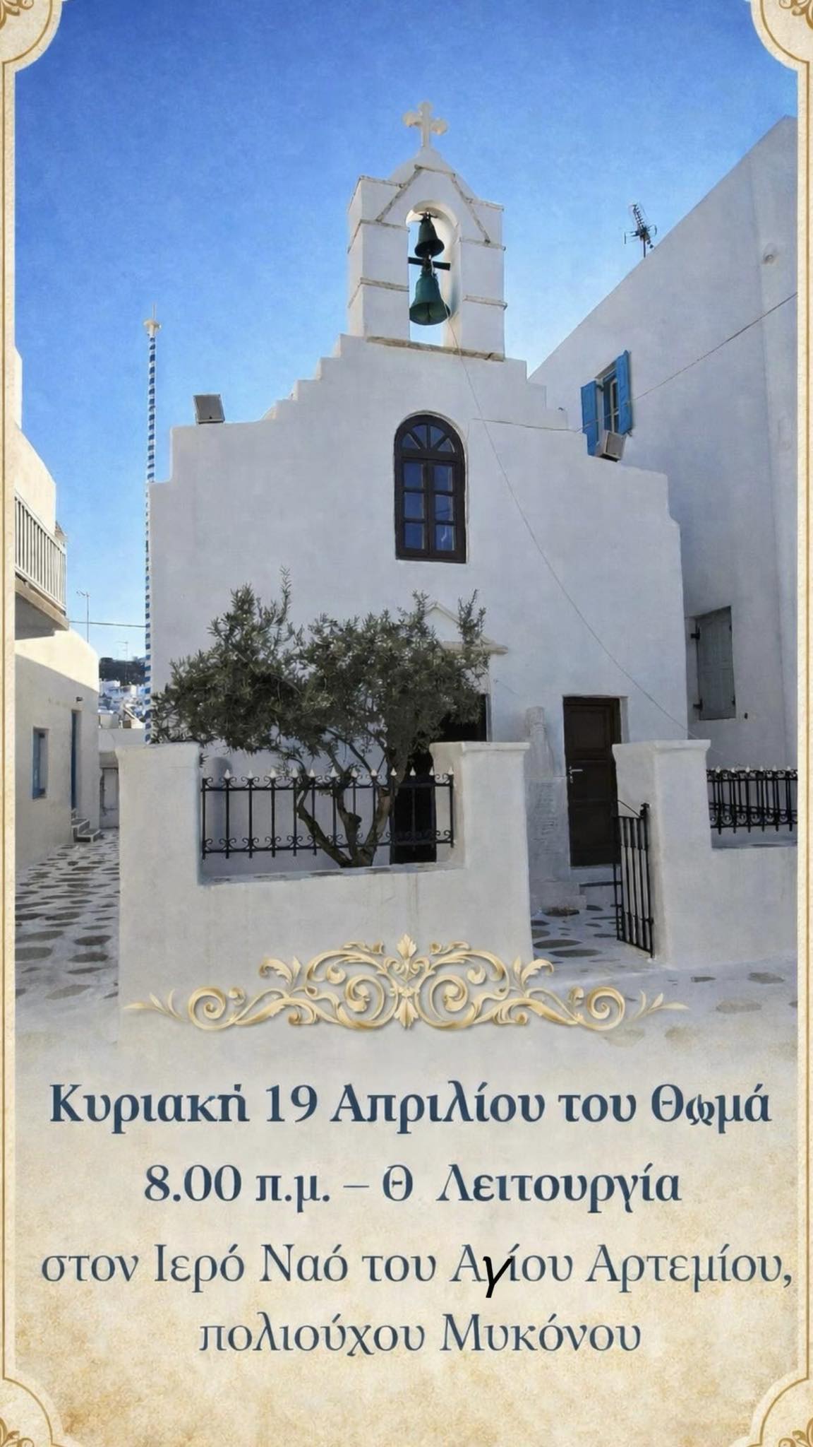 L'anziano più reverendo p.. Petros Maragos, Sommo Sacerdote Commissario di Delos e Mykonos, με αίσθημα βαθιάς ποιμαντικής ευθύνης, απευθύνει ένα θερμό, κλητήριο σάλπισμα προς τους φιλακόλουθους Μυκονίους και τους ευσεβείς επισκέπτες του νησιού. Τους καλεί να συμμετάσχουν στην Θεία Λειτουργία (Ora di inizio 8:00 a.m.) που θα τελεσθεί στον φερώνυμο, πολυαιώνιο Ιερό Ναό του Αγίου Μεγαλομάρτυρος Αρτεμίου, Πολιούχου της Μυκόνου, στην καρδιά του παραδοσιακού οικισμού της Χώρας.