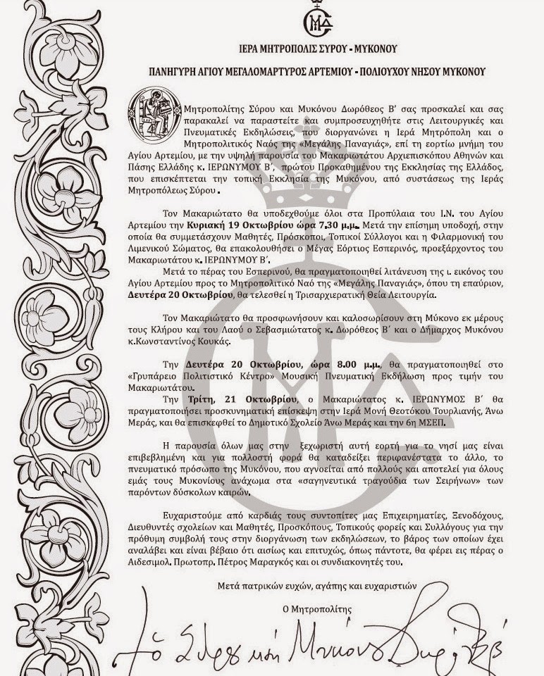 состоится на Миконосе, в честь святого великомученика Артемия, Святой покровитель Миконоса ( ПД. 139/2013, 222/A΄/17.10.2013 Официальный вестник), от 19-21 октября, по вышеуказанной программе.